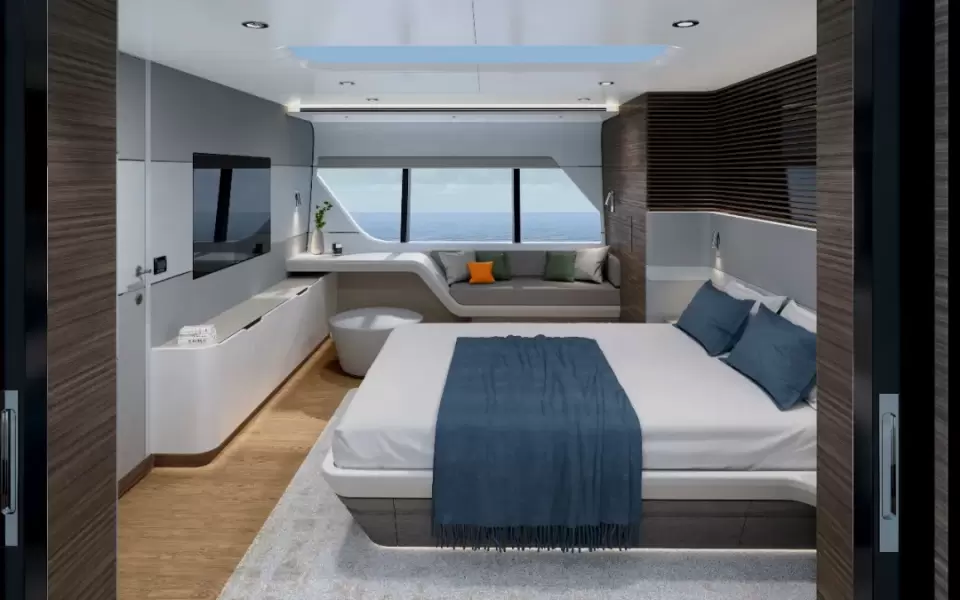 在主甲板下方,CLX96提供豪华舒适的休息空间,包括四间贵宾套房和两间船员室,糅合天然与高科技材料和现代感元素,房间里许多细节都能体现精致奢华,调动起宾客对海上探索的兴致。全梁宽的主人房设有一个真正的天窗,并与VIP客房的虚拟天窗互相呼应。